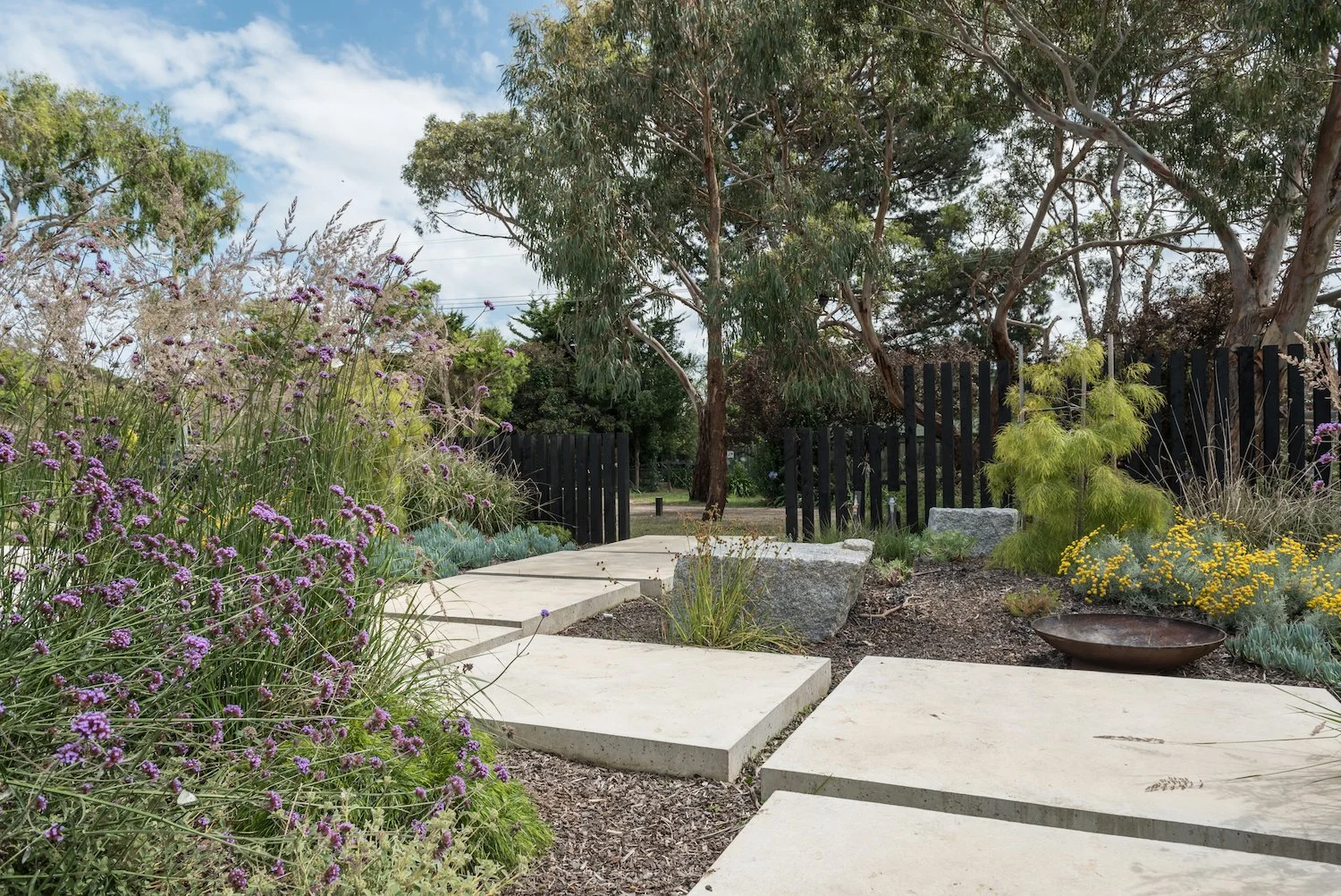 Thick, individually formed concrete slabs create a structured yet organic pathway through the garden.