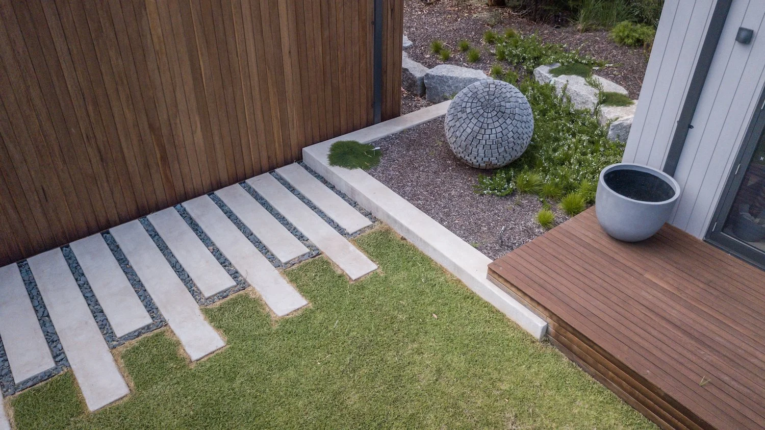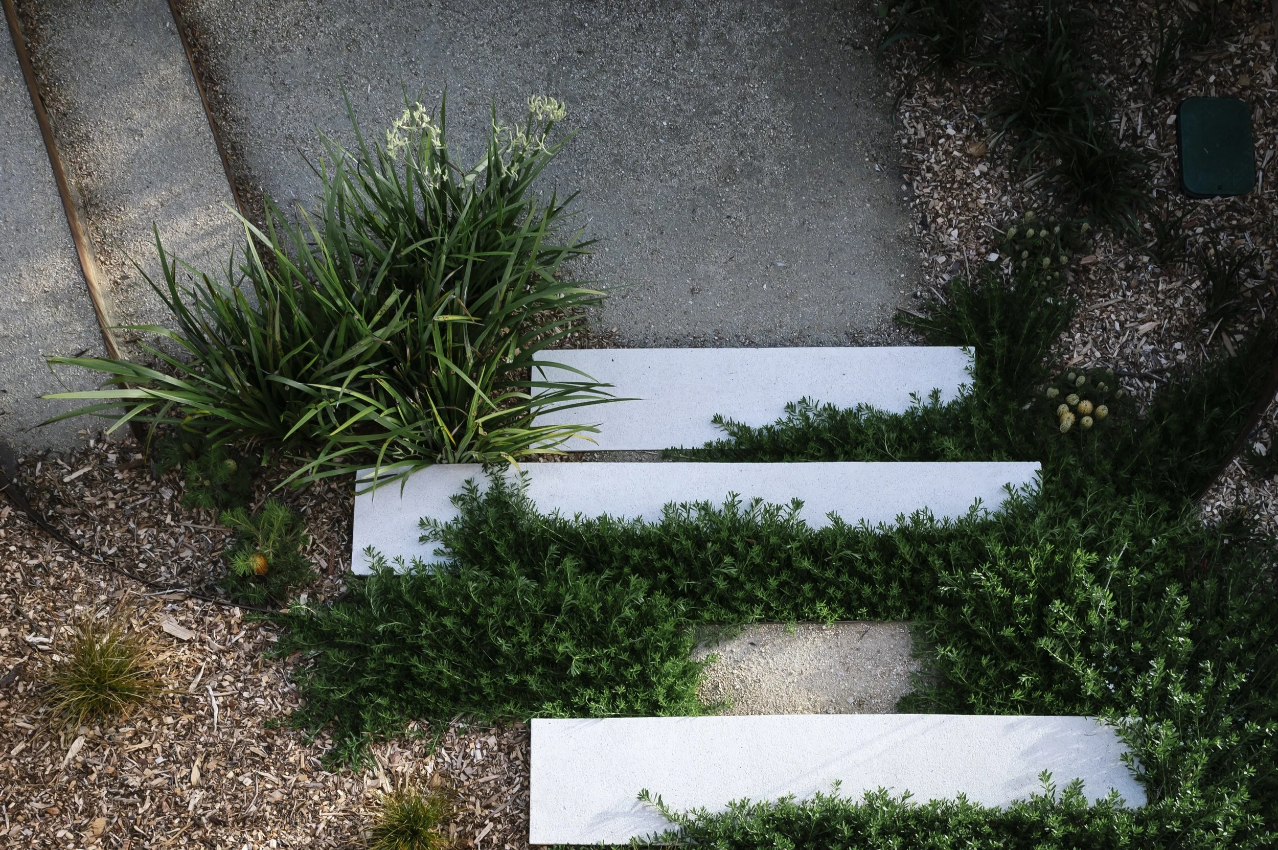 Linear concrete slabs strategically placed to add texture, contrast, and a functional walkway through the landscape.