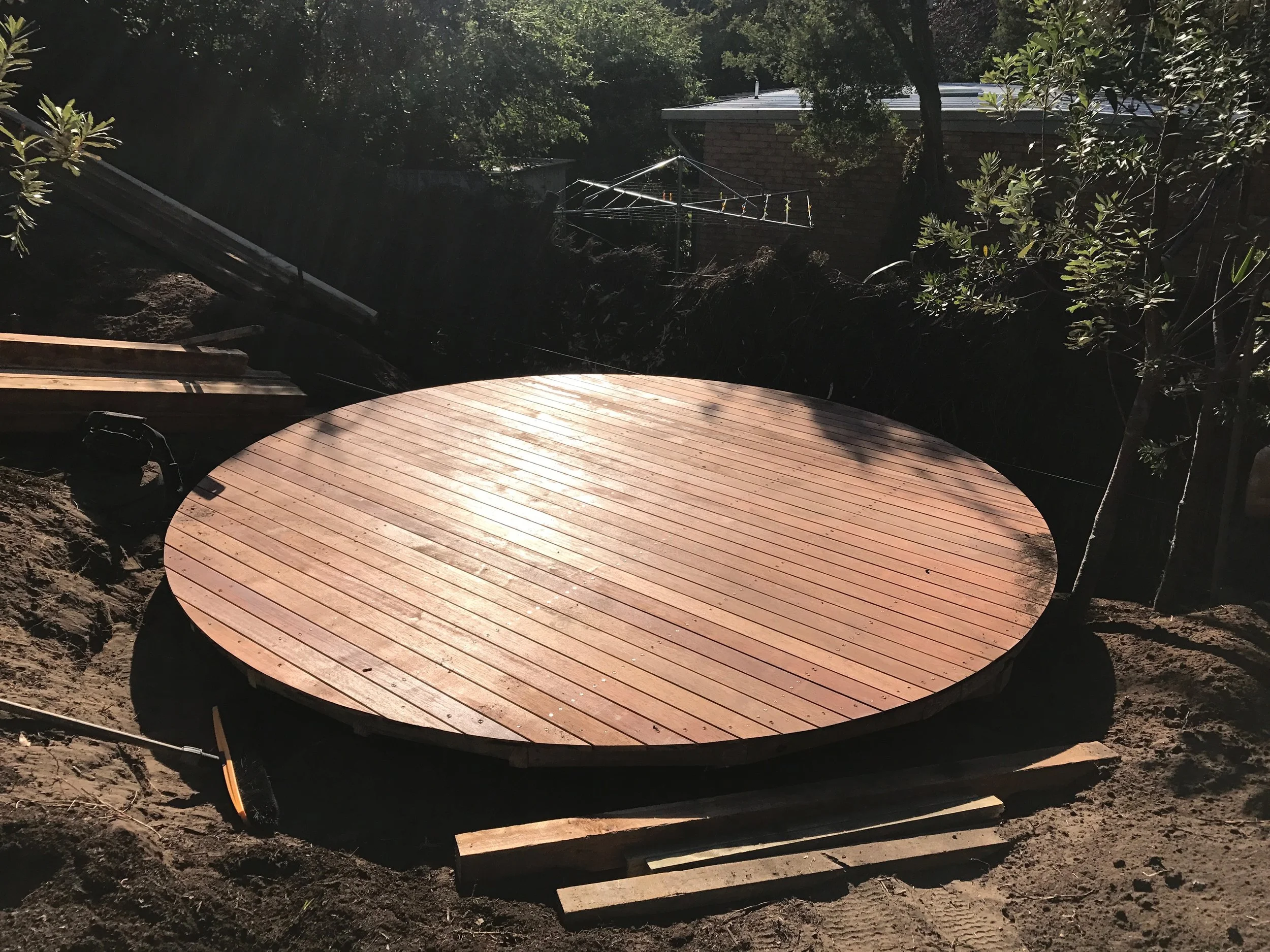 A beautifully crafted circular timber deck creates a unique focal point, softening the landscape with its curved form while providing a perfect spot to relax and unwind.