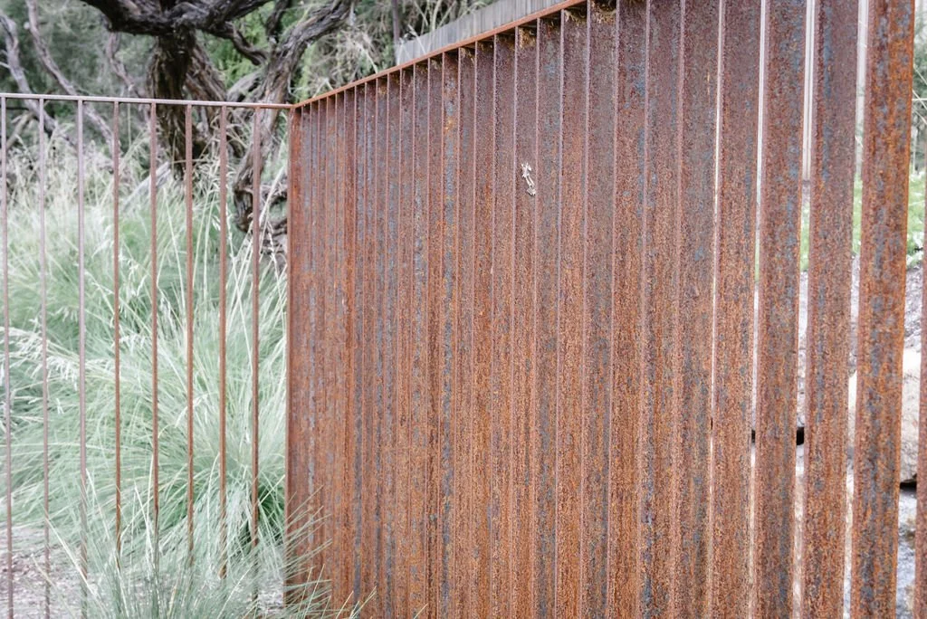 Fabricated on-site and allowed to patina, this steel batten fence allows for deflection while remaining pool compliant. Expert welding and buffing ensures seamless joins for a flawless finish.