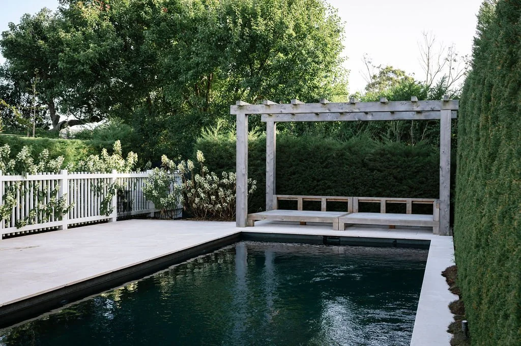 A custom-built timber arbour brings structure and shade to this poolside retreat, while the removable lounge offers a flexible, stylish space for relaxation.