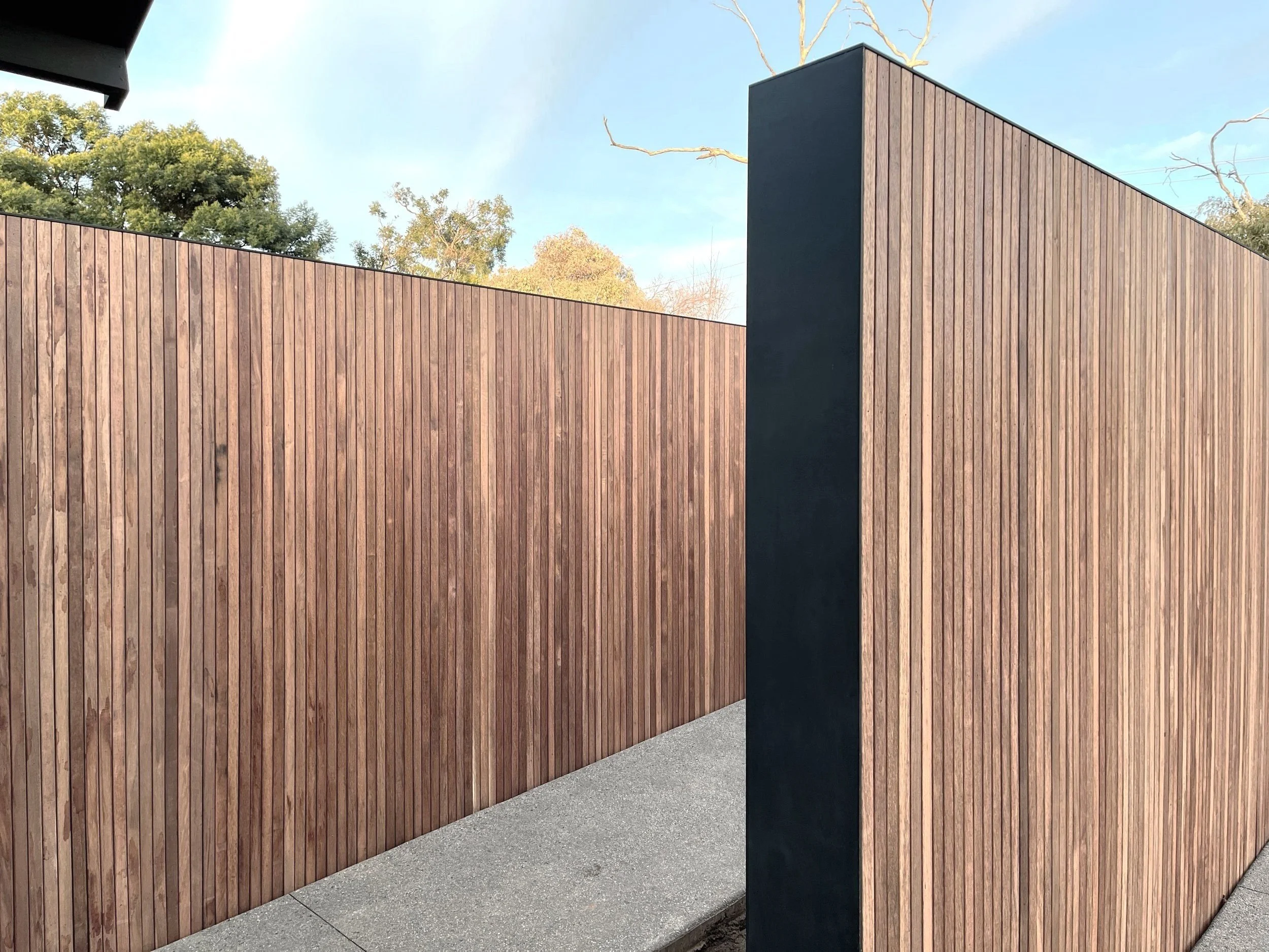 A striking batten screen framed with black steel edges provides privacy, structure, and a modern architectural element to the space.