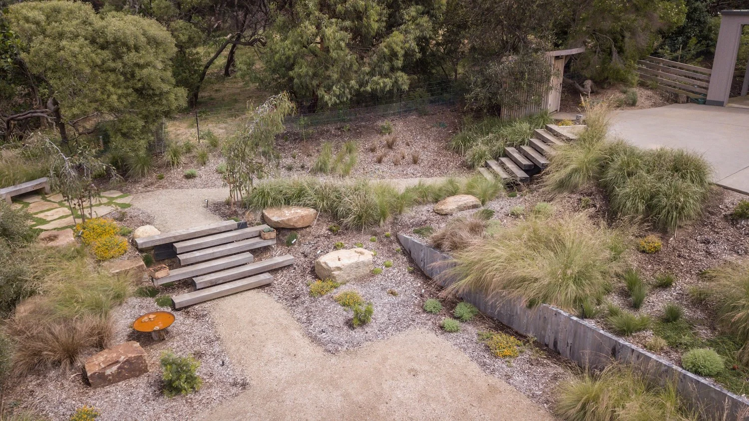 Floating cypress slabs create an inviting and organic step design, seamlessly integrating with the landscape while providing a durable and stylish transition.