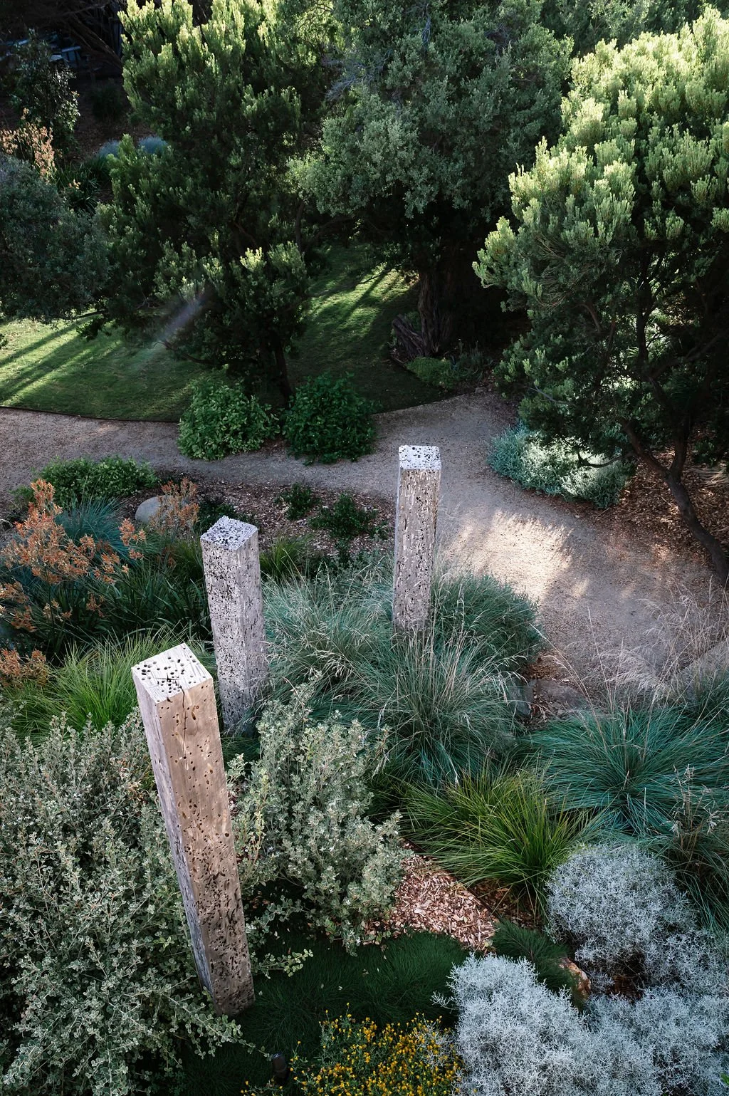 These cypress totem poles make a bold visual statement while anchoring the garden space with strength, character, and natural beauty.